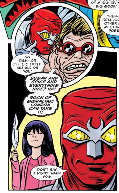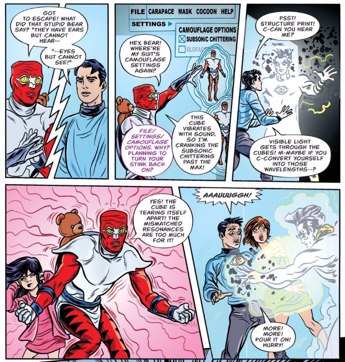 The Allreds look like they’re having a ton of fun on this project, but especially on this panel, where Forager and Kuzuko’s ultra-smug expressions are just so lovingly rendered. Dr. Spider is a fun and absurd enough villain on his own, the torture-by-tickle really makes me laugh, but it’s just their faces that really stuck with me.