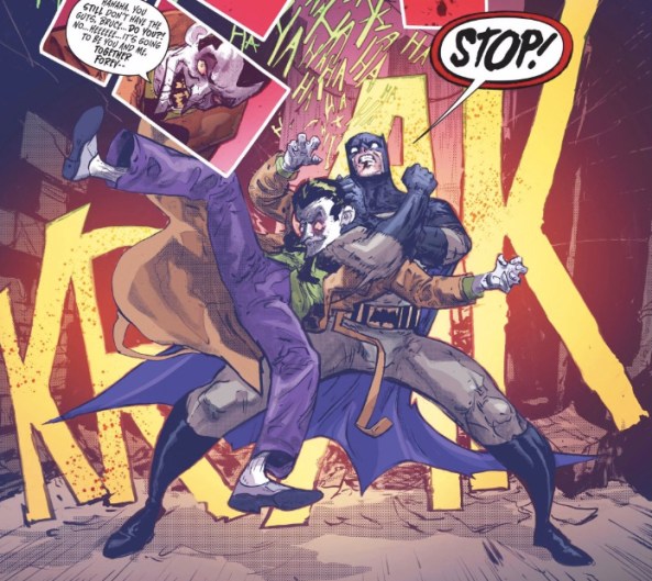 Colorist Ivan Plascencia keeps things bright — Joker’s outfit bears true greens and purples, Batman’s cape and cowl show more blue than black, the sound effect is so bright is almost acts as a light-source in the scene. A lot of the shadows are accomplished by digital stippling, and those dots accomplish two things: 1) they evoke an earlier era of color printing in comics and 2) they allow the un-darkened color beneath the dots to show through. I know it’s weird to make the claim that the scene of Batman punching Joker’s teeth out of his face and snapping his neck isn’t as dark as it could be, but this is all still within the realm of “imaginable.” If The Batman Who Laughs–and by extension, Tynion and Rossmo–have something genuinely shocking to show us, it isn’t this.