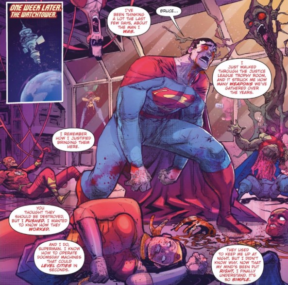 The set-up to this point is basically perfect. Batman’s morality is tested, as it has been so many times before, only this time he fails. On the very next page, Superman shares his concern that this may be the start of a slippery slope: kill one supervillain and maybe it makes sense to kill all supervillains. But Bruce, rightly, waves that away. “I’m not sorry he’s dead, but I won’t give him the satisfaction of becoming what he wanted me to be.” Which is great news, right? There’s a very real fear that any of Batman’s more brutal or authoritarian qualities would lead him to being a bad dude, but Bruce has just assured us that that’s not what we’re witnessing in this story.