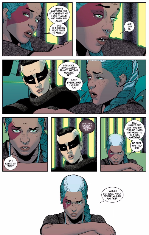 Thus, I think the third great theme of The Wicked + The Divine (after art and mortality) may just be the generation gap, that age-old conflict between the old and the young, between parents and their children. It seems notable, then, that Persephone rises above the animosity that seems to have defined so much of the Pantheon’s relationships with their parents.