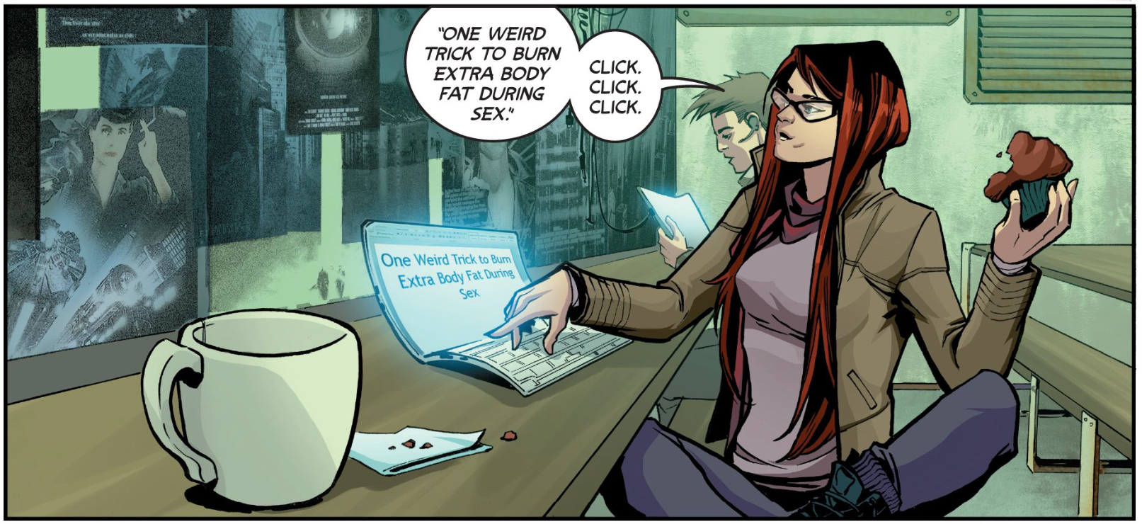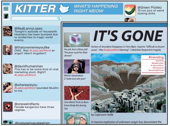After a prologue where a V for Vendetta-like masked woman with the moniker “Lady Lastword” ends up blowing a crater into Jerusalem (here again the issue flirts with hot button issues for opaque reasons), the focus of the issue turns to two writers: Capricorn Halle and Kennedy Avis. Capricorn is introduced as a Legitimate Journalist, refusing to run an article about Lady Lastwood until she’s satisfied it’s the truth, while Kennedy is working for BuzzFeed surrogate Eye Know, haphazardly churning out content like “One Weird Trick to Burn Extra Body Fat During Sex”. When Capricorn dies suddenly after suffering from a sort of superpowered psychic connection, Kennedy is unwillingly thrust into a quest for the Truth.