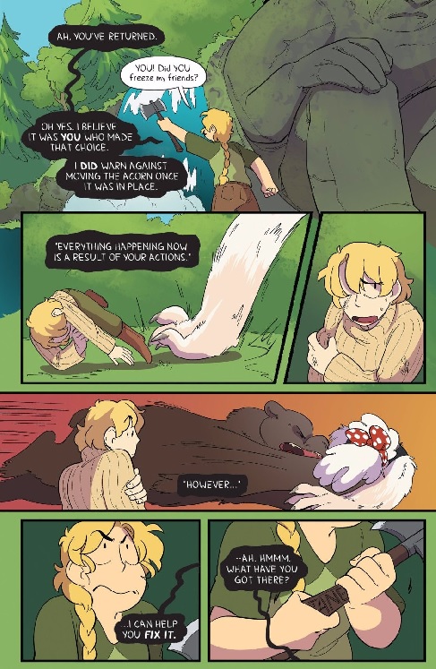 I will highlight that I said that kid’s books should be held to a higher standard than adult books. All communication (and that’s what art is) comes down to clarity, and if you wish to use more advanced vocabulary like a mid page transition, there should be a greater expectation that such vocab is used in a way that best achieves the goals of good communication. For example, the Lumberjanes page probably would have been stronger if they did not use a second character with blond hair, or differentiated the backgrounds a bit more so that both scenes weren’t defined by strong greens. That would help even a kid reading their first comic have a clear understanding of a relatively more complicated technical flourish.