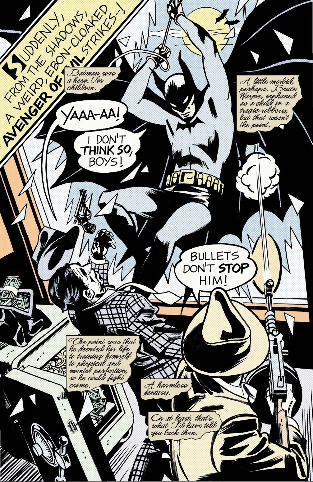 “A harmless fantasy. Or at least, that’s what I’d have told you back then.” Busiek is setting us up for tragedy from the very beginning of this story. After the Wainwrights get murdered within the first few pages, you might think that this was the tragedy in question: a little boy losing his parents and his obsession with Batman in the face of coping with his parents’ death. In hindsight it seems like the tragedy that Alton alludes to is yet to come; likely caused by Bruce’s terrifying bat creature.