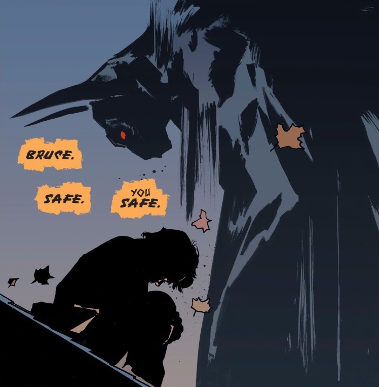 What is clear is that the bat creature doesn’t appear in some form or another until Bruce gets shot. As he’s coming out of his coma he hears the doctors’ voices, but before that there is another voice telling Bruce his is “SAFE.” Letterer Todd Klein provides this disembodied speech balloons that scratches its way out of the ether — one we will later discover is the voice of the bat creature. The creature’s speech balloons stay disembodied throughout, as it doesn’t actually seem like it has a mouth to speak from. Is Bruce the creature? Is it merely his proxy protector?