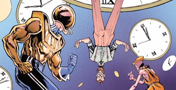 Which means colorist Maria Santaolalla leans in to the look of four color printing, emulating the technique with millions of little dots suggesting colors beyond cyan, magenta and yellow. It is immediately evocative of an earlier time in comics, even as St. Claire’s detailed inking betrays the issues modernity. It’s a neat little trick that the rest of the series has done with in-universe stuff — make it look sorta like the past, but just different enough to make the reader ask “what the hell?” And that’s Fu’s backstory in a nutshell: just close enough to the backstories of characters like Superman, Wonder Woman, and Captain America with a twist that upsets the whole thing. As Shaolin Lad, Fu is more like Bucky to Golden Arm’s Captain America, with the funky wrinkle that he skipped World War II. It’s a dizzying bit of mythology, played out against Golden Arm wailing on their enemy.