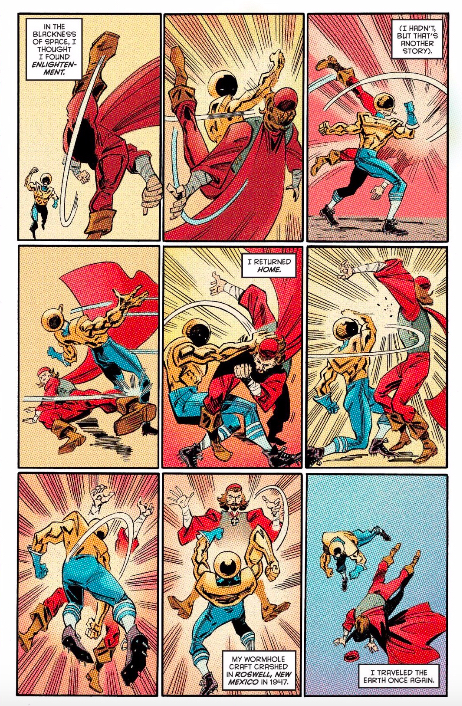 Of course, things get a little too intense when Robert Wadlow comes back and runs a sword through the young Shaolin Lad. I’m not quite sure what to make of Fu Jitsu himself traveling into the same meta-history to pull Wadlow back to the present. The present, by the way, is colored normally, but retains the pulpy, excitable narration banners of the imagined Silver Age version of this comic.