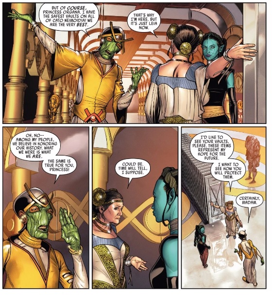 While this occupation of theirs isn’t all that endearing, it at least goes a long ways to establishing a culture for the Neimoidians that had been absent before. Charles Soule isn’t working with a lot of material here, and it’s true that they are still being characterized as evil and petty, but it’s a welcoming turn to see them portrayed as something other than an offensive caricature. More, Soule intimates that they have a complex system of honor and history, as they still consider Leia a princess simply because at one time she was called that. It suggests that to the Neimoidians, time isn’t so linear as it is for humans.
