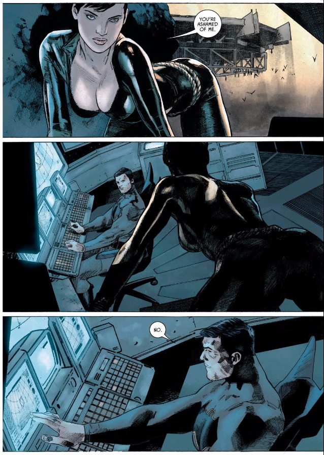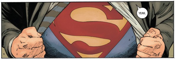 (This does seem like the right time, though, to note that if this issue has one weakness, it’s its gender portrayals. Lois and Selina both have plenty of personality, agency, and motivation of their own here, but their primary role is still to talk their men into opening up emotionally. Artist Clay Mann contributes beautiful, dynamic work to the story, but also sometimes comes across as male-gazey, especially in pages like the one I posted above, where there’s no reason to pose Catwoman like that other than for male readers to gawk at her. I’m a bit uncomfortable even including that panel, if I’m being completely honest.)