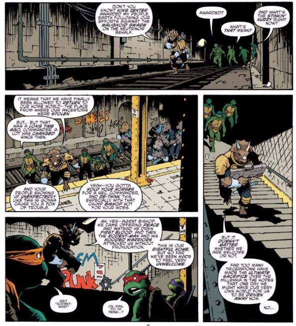 The folly of the Triceratons in recognizing the present and longing for the past has put both them and everyone who lives on Earth in danger. I can only hope that cool heads will prevail and the turtles will be able to bridge the gap between the Triceratons and Splinter and Angent Bishop. If they don’t, the Earth as the turtles know it, may be history.