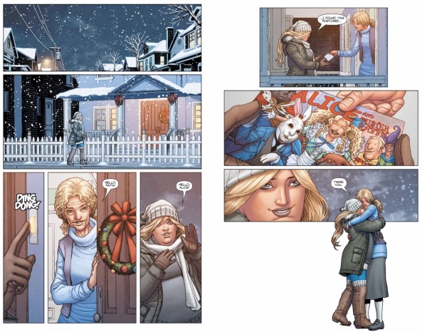 Faith’s Winter Wonderland Special finds Faith sucked into a version of Wonderland (as in, Alice In). Because of her childlike heart and her ability to follow her dreams, Faith is the only one who can rescue Alice from the darkness that’s consumed her, a darkness made up of corporate mandates and greed, choking out Alice’s ability to use her imagination and dream. I understand and appreciate what this portion of the story is attempting to say, but also don’t know if I fully agree with all its points. Adult responsibilities aren’t always the antithesis of childlike wonder and imagination (or, at least, they don’t have to be), and despite what Bill Watterson might have you believe, art and commercialism can coexist side-by-side. Art’s true worth should be measured separately from monetary value, of course, but corporate support is usually required to create and broadcast art, and talented artists (including the creators making these very comics) have found ways to balance the needs of both without compromising their vision for years.