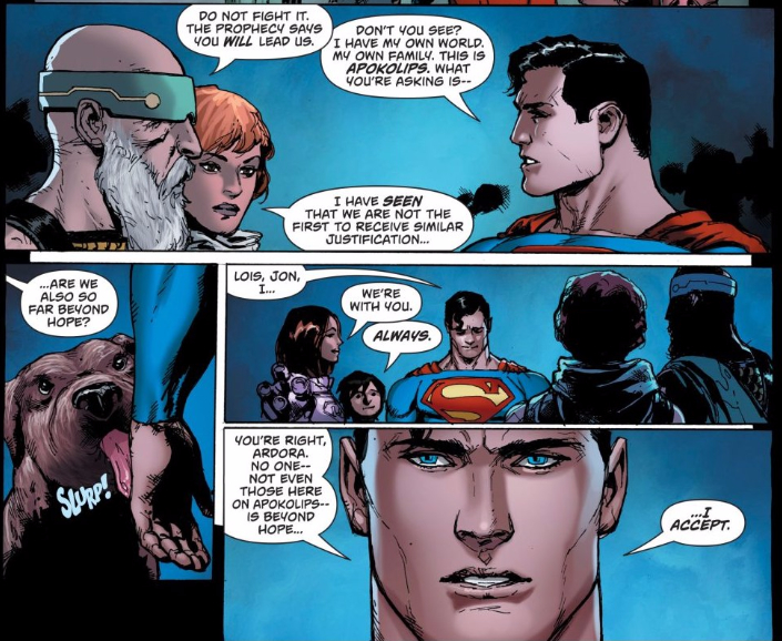 Tomasi, Gleason, and artist Doug Mahnke make a gem of an observation here. Superman is a beacon of hope, of course, but his true ability to inspire comes, not from what he can do, but from his faith and belief in the inherent goodness of everyone. Apokolips is a dark, twisted world built on humiliation and despair, but in his brief time there Superman sees the potential for more, and it’s that faith that allows compassion and hope to bloom on Apokolips.