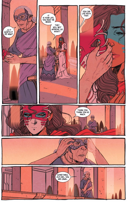 The Emma Vieceli-illustrated “Decomposition” finds Tara torn about what direction to take her career. Ananke’s advice brings Tara some comfort for the moment, but WicDiv regulars know that Ananke is up to no good before we even reach her final line. “You can live with that” is such a cruel piece of advice because, no, Tara can’t live with a disapproving, hateful public — this decision is the first step towards Tara’s eventual (assisted) suicide, and the kicker is that Ananke had been manipulating Tara and leading her down that path from the very beginning.