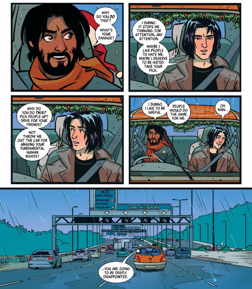 Sorry to spend so much time on that story, but the the Eleanor/Luci/Hazel/Amaterasu dynamic is one of the most sharply drawn for me in this issue, and the one I probably care about the most. I think it’s fair to say that these stories are largely inessential — nothing here is vital to understanding the actions or motives of these characters in the story proper — which leaves the issue suffering from some of the same problems that plagued the Star Wars prequels: some scenes play out exactly as we always assumed, simply reiterating what we already know about the world, while others make needless connections that make the world feel smaller than it ever did before. There’s still plenty of fun to be had seeing these characters be themselves (especially at a time where they weren’t battling mysterious undying forces), but it’s pretty disposable. What else could you really want from a Christmas Special?