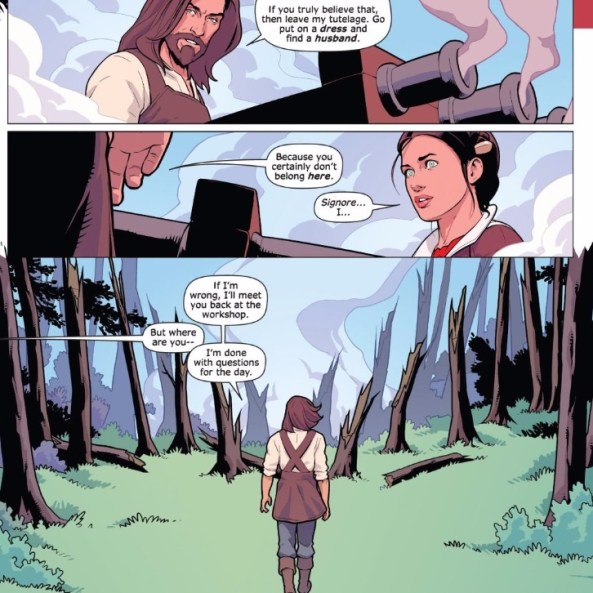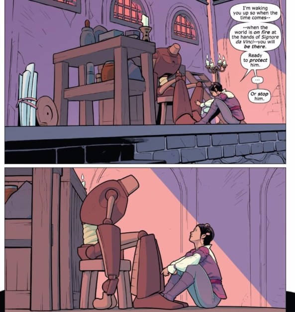 “He” or not, it’s clear that the machine is taking to Isabel over its creator. After all, it did briefly assault da Vinci after one such “he” vs. “it” debates. The science of how the automaton works is unclear, nor does it really matter. Historically, da Vinci did have sketches and plans to make an “artificial man,” which is what this is based on. What Allor and Evenhuis want to make clear that by not “resetting” the automaton after every “mission,” Isabel is conditioning it to become more human and to trust her. It seems that da Vinci’s hubris might not allow him the insight to realize this betrayal.