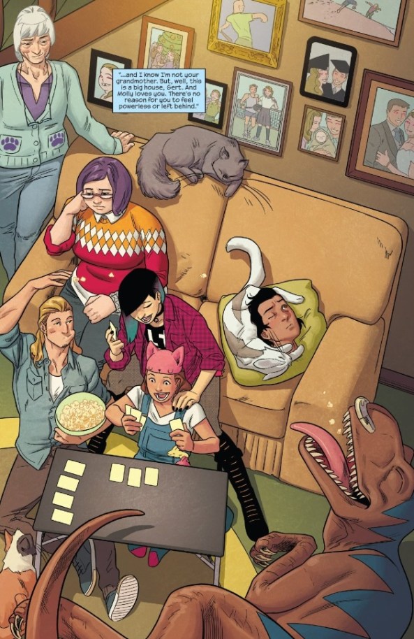 In any other series Gert’s choice to stay with Molly and her grandmother would probably be a triumphant moment, but not in Runaways. It’s not just because this arc is inevitably leading to these kids being together again — to the realization that they will always be each other’s closest family, and at their best when together — it’s also because Molly’s grandmother is clearly up to something. She’s taking samples of Molly’s DNA, and sneaks some of Victor’s as well. It’s because her cats have been spying on the team since issue 1, and because it’s implied that she may have created/cloned Molly’s mutant parents. Whatever she’s up to, I don’t think Dr. Hayes is the stable presence the Runaways needs, and I’m terrified — but also excited — to see what will happen when these kids realize that.