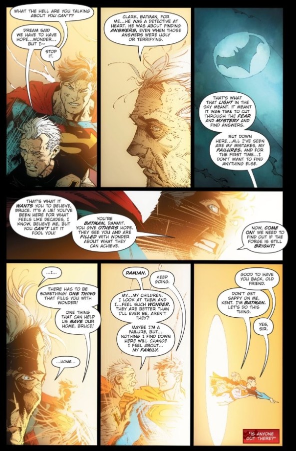God, I love this beat. It’s a chance for Superman to do what he does best: inspire. It’s a chance for Batman to fully embrace his family (and admit it out loud!) in a way he so rarely can. Most importantly, it’s a reminder that, despite all their differences, both these characters — and superheroes in general — are about finding hope, staying determined, never giving up, and showing readers how to do the same. Doing so allows Batman to move forward when nothing else can.