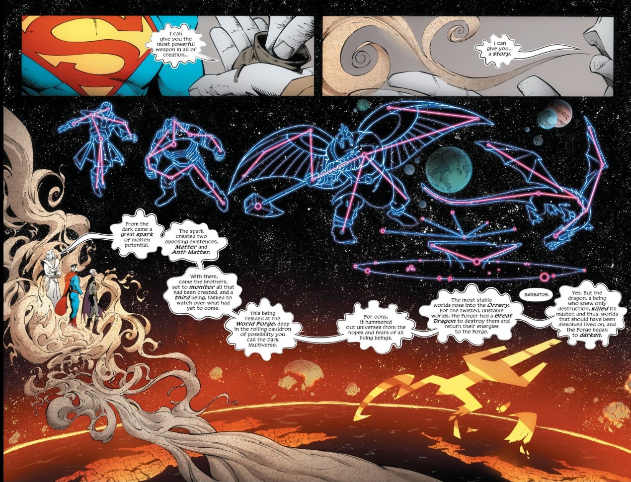 The Forge hammered out universes from the hopes and dreams of all living things, but only the most stable became a permanent part of the Multiverse. With the metaphor of worlds-as-stories already established, this becomes an insightful look into how stories are created, the way storytellers must tap into their own hopes and dreams (and the hopes and dreams of others) to create worlds in their stories, but how countless worlds are discarded before creators can find stories that are worth telling, or that sell, or that catch on with readers.