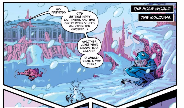 Just in this panel alone, not only do we get an adorable ice-skating goblin, but some sort of ritual surrounding a giant snowman! Super fun details like this are hidden throughout the issue, making it a joy to read just to find all the Easter Eggs. It does make me wonder about the nature of the Hole World, though. How absolute is Sizzajee’s control? Does he even rule over it at all, as I once thought, or is he more like a supervillain just menacing this world? Or has the Hole World just gotten that much worse between the time this story takes place and the present day?