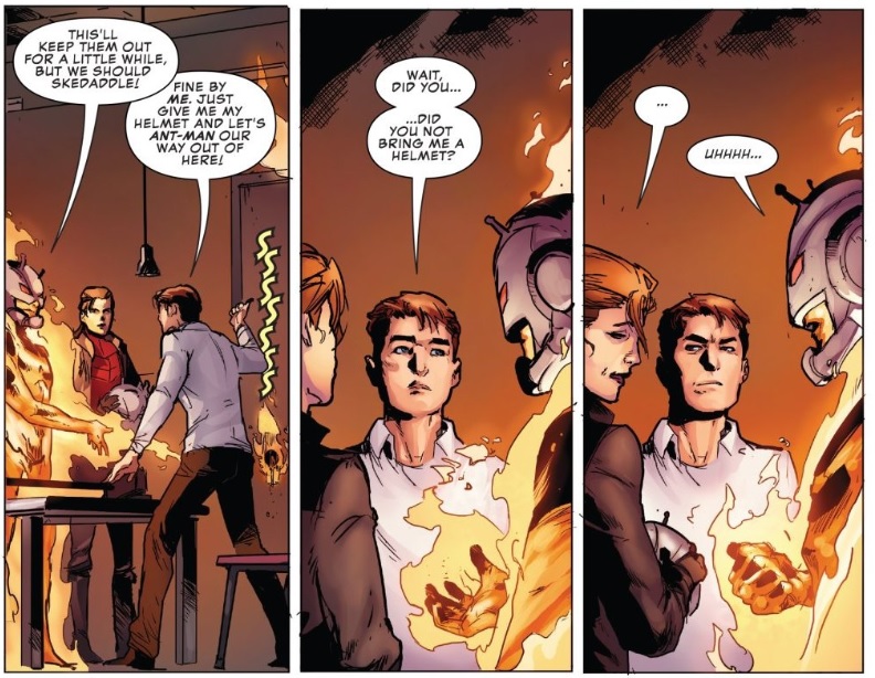 We’ve read plenty of books where the hero thinks of everything and plans ahead, but to miss such an essential detail as say, an extra Ant-Man helmet is simultaneously relatable and comically unbelievable. Zdarsky heightens Johnny Storm’s lack of forethought/doubling down on his mistake by putting on an over-the-top performance as he takes Peter’s place in custody.
