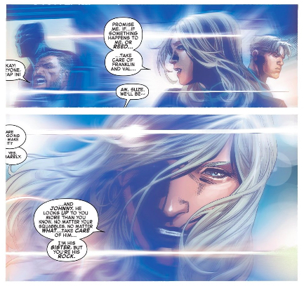 Jordan is Michael B. Jordan, who played Johnny in the 2015 movie; Evans is Chris Evan, who (before landing the role of Captain America) played Johnny Storm in both 2005’s Fantastic Four and 2007’s Rise of the Silver Surfer; and Underwood refers to Jay Underwood, the actor who played Storm in the not-actually-released Fantastic Four film from 1994. This is maybe little more than a cheeky breaking of the fourth wall, but in the context of Johnny’s possible suicide attempt, the reader is forced to consider what this does to the weight of the scene. Johnny’s life isn’t hard despite the comic book silliness around him, but because of it.