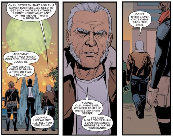 Logan doesn’t rule out that Xavier is truly and fully returned in his full capacity. However, having died before, Logan knows that that coming back from the dead isn’t an easy experience. The “deeper” thing Logan refers to here may not be some sort of evil force possessing Xavier, but it could be something that has fundamentally changed the way Xavier sees and interacts with the world. In either case, its perhaps best to heed Logan’s advice. While the return of a beloved character is always exciting, it’s best to wait and see what they brought back with them before celebrating their return too much.