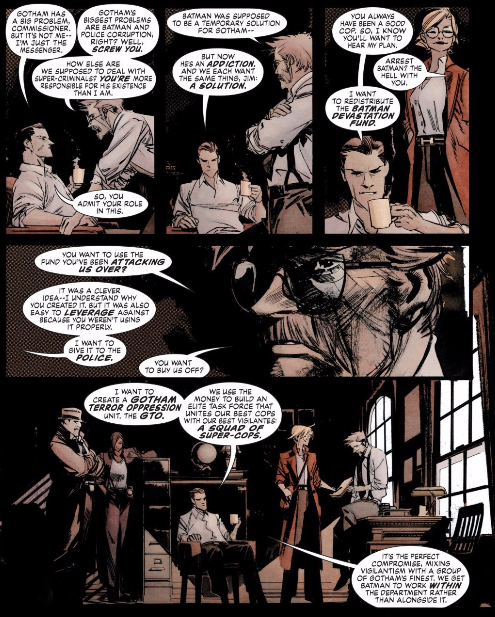 Corruption isn’t the only problem with a militarised police force. The militarisation of police is one of the biggest problems with America at the moment. It would a really bad idea even if Gotham’s police weren’t corrupt. Hell, that was a big part of Superheavy, to add to the list of ‘things the Batman books have already addressed’
