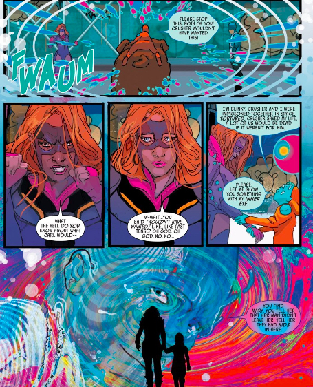 The issue starts in something of a familiar place, with Black Bolt and Mary squaring off. Of course, Black Bolt comes in peace, but y’know, we’ve got hero-villain dynamics to fulfill here, so it comes to blows immediately. The fighting is stopped when Blinky steps up and offers Mary a vision of her husband as a good man who sacrificed himself to save his friends. This is the first of many left turns the issue makes as Ahmed summarily rejects the label of “villain” for ol’ Crusher. Ward recognizes this and sets the moment off with a goddamn fireworks show: