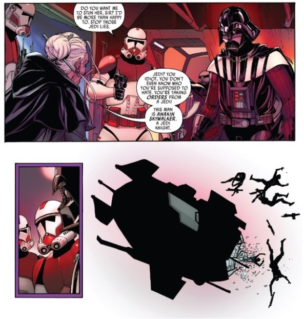 This panel of picture-perfect leaping is followed by Vader murdering a stormtrooper a panel later, which strikes a perfect balance in showing both the beauty and beastly nature of a young and virile Vader. As this illustrates, Vader and Anakin once used to be more closely connected. While that knowledge helps Jocasta win a moral victory at the end of this issue, it also is the reason Vader, a more powerful Jedi, was able to defeat her.