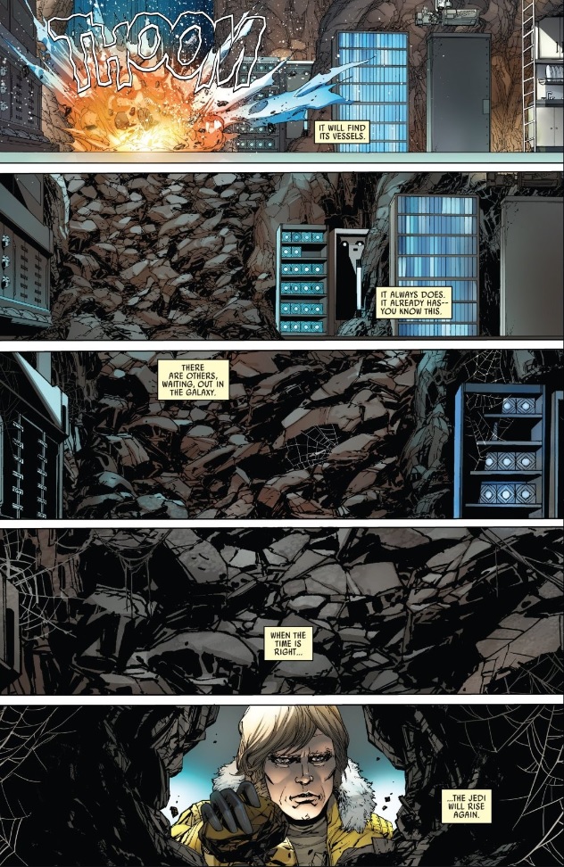 The narration here is an echo, a reprise of the speech Jocasta delivers to Vader at the beginning of the issue. The Force will always seek to find balance, and when Jocasta can no longer help it do so by finding and training young Force-sensitives, she does the next best thing: she manipulates Vader into destroying the list, thus protecting those children and allowing them time to rise on their own, which we can see them eventually do in the form of Luke Skywalker himself. Jocasta’s wisdom and knowledge of the Force allows her to better understand the role she plays, to not get hung up on the details but rather on results — and she’s more than willing to sacrifice herself to get them. Jocasta has valuable perspective that Vader often lacks.