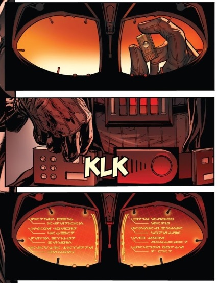 When he captures the data file with all of the young, potential Jedi names on it, he uses a function of his suit to view it immediately. In showing us this, Camuncoli puts the camera behind Vader’s mask so we get a view of what’s like to be in Vader’s shoes. In this way, Camuncoli literally is forcing us to consider what things look like from Vader’s point of view, which once again reinforces the idea that even though he’s evil, Vader is someone who you can empathize with.