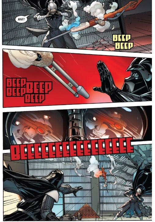 By cutting off the visor of his helmet with the upper boundary of the panel, Camuncoli has managed to make Vader’s goggles look wide-eyed and scared. Fear is an emotion everyone knows in one form or another and seeing Vader scared of something makes it easier to connect with him, even if most of his emotions are hidden behind a mask. Later, Camuncoli once again uses Vader’s eyes to help make him more relatable.