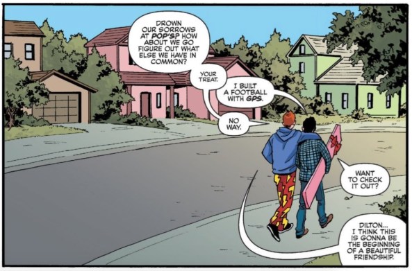 Of course, both of these characters are heading into different ways of dealing with their problems. Arch, ever the inactive player, is going to press on as he always does — by being sad and sweet and not wanting to hurt anyone. Ol’ Dilton, on the other hand, is throwing emotional caution to the wind and is going to take action to win Betty’s affections. Neither one of these courses of action is particularly mature, but y’know, we’re talking about the Riverdale kids, so some of that is to be expected. The fact that Arch and Dil actually cross paths makes their different approaches to this situation all the more obvious and explicit. I love love love the idea that the houses they’re walking in front of in the first two panels are literally right next door to each other (as we can see in the third panel).