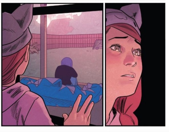 It’s only when she sees Gert make the same choices that she realizes that they need to leave. Kris Anka captures the moment in a panel that focuses on Molly as she gazes on Gert through the window.