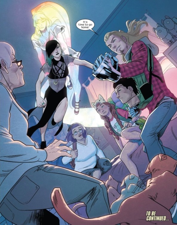 Molly’s expression takes on a more sophisticated and mature look. The despair in Molly’s eyes is stark, especially for a girl in a bunny hat. Rowell lays out the situation by giving Molly exposition that doesn’t feel heavy handed. It may have been two years, but Rowell is able to imbue the interactions of the former Runaways with the comfortable rhythms and established dynamics of siblings.
