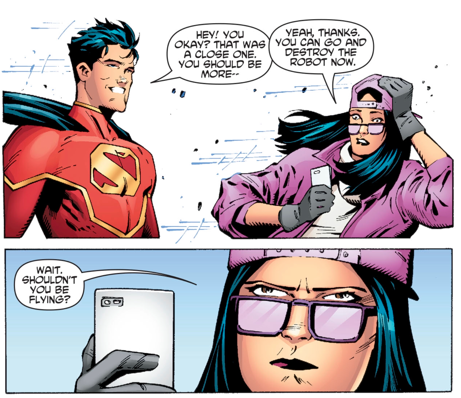 New Super-Man 19 takes place early in the New Super-Man timeline, about 6 weeks after the debut of Kenan as the New Super-Man. We learn that, thanks to a hot tip and a lot of good old fashioned investigative reporting, Laney knew that Dr. Omen is Kenan’s mom way before Kenan got brought up to speed. But outside of this one bit of news, Tamaki isn’t concerned with Super-Man or Bat-Man or superheroes at all. Instead, the issue is the portrait of a talented young person frustrated in her life. She treads water at work, pumping out government-approved puff pieces for Primetime Shanghai instead of the investigative reporting she wants to pursue, and her family life is a mess — her father lives in America and sends money back to her and her mom in China, all the while leading a second life with an American wife and kid.