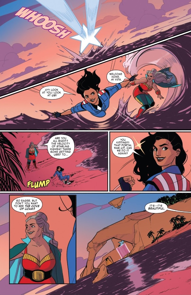 That kind of will and emotion is what makes the second act such a joy. Artists Stacey Lee and Flaviano and colorists Jordan Gibson and Chris O’Halloran do great work throughout the issue, creating dazzling settings and landscapes full of character, characters packed with clear emotion, and several cool-as-hell outfits for America, but it’s in this second act that they shine brightest, conveying the thrill and sheer joy America feels to be pushing the boundaries of her power with her grandmother, Madrimar.
