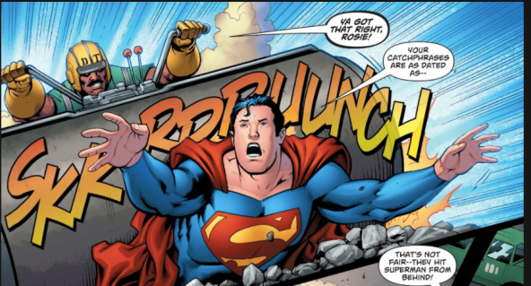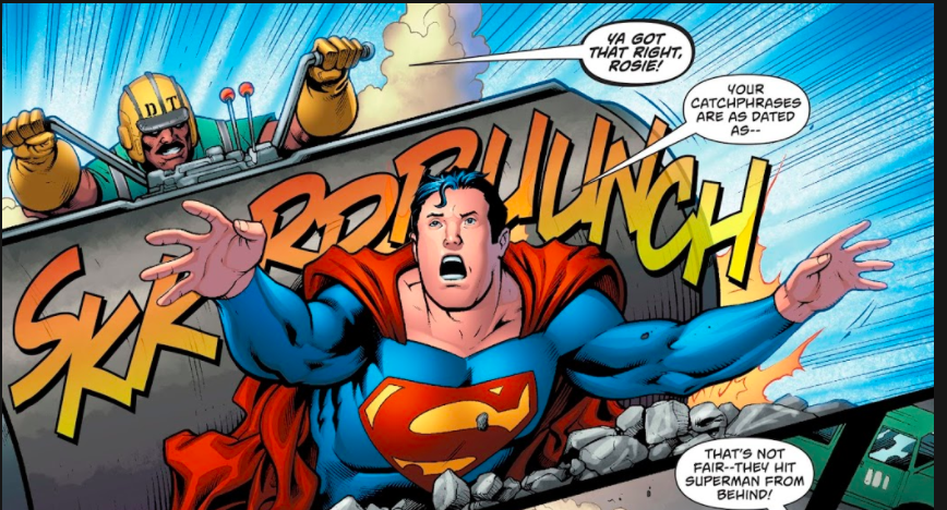 Pete Tomasi and Patrick Gleason don’t want us to mistake old-fashioned for hokey however. The issue opens with a Superman “fighting” the construction-themed Demolition Team.