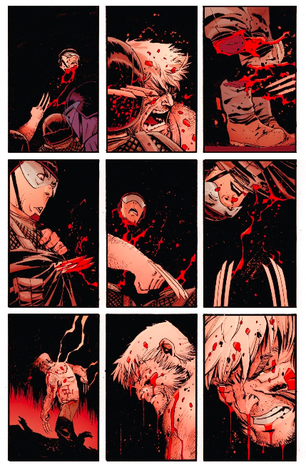 Each of those first six panels shows the claws doing something they ought not to be able to do. I mean, look at that first one – not only is he popping a guy’s head off, it’s not even clear which body that came from! Or that third panel: it’s like Logan is just erasing part of their bodies. It is a balletic explosion of violence, always focusing on those three blades.