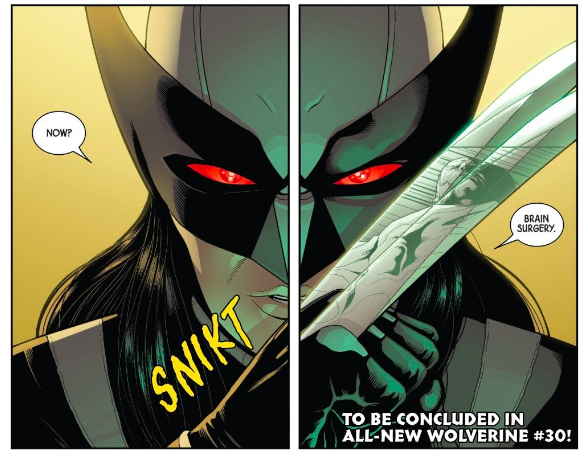 Another example of ingenuity is what I will call “the Muramasa workaround” — which I’m not sure if Taylor introduced or it has appeared before. In a very Walking Dead manner, a Wolverine can survive a Muramasa wound by removing the tissue affected by the mystical weapon, which allows their regeneration to kick back in. Which leads us the the conclusion of All-New Wolverine 29: