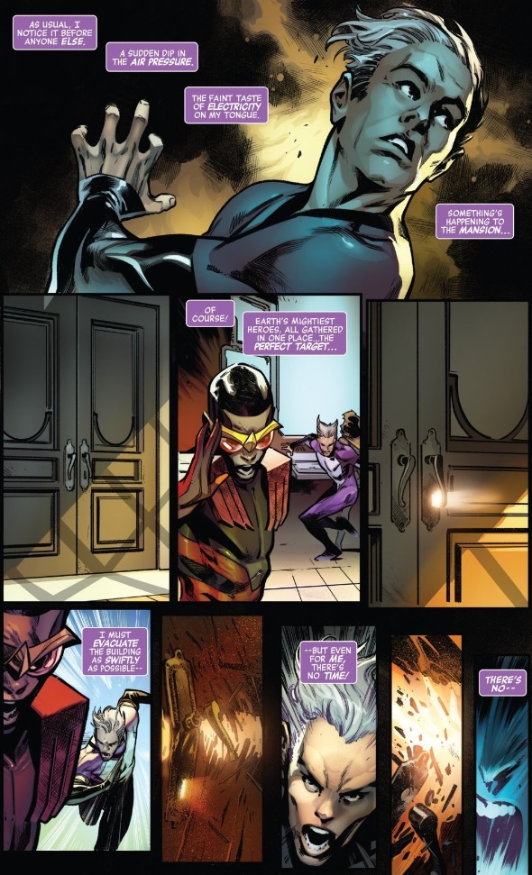 In fact, the very first page is practically a masterclass, not only recapping the cliffhanger from last week’s issue, but using it to immediately establish the traits of Quicksilver the creative team will spend the rest of the issue exploring: his ego, his need to prove himself, and his constant failure to do so.