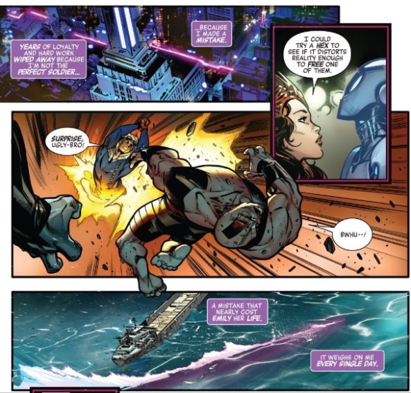 The focus on Quicksilver also adds some extra intrigue to the ongoing plot. This week, Scarlet Witch manages to cure Vision of the paralysis that’s afflicted much of the teams, but in the process, freezes Quicksilver instead. In any other issue I might think he was frozen randomly in a sort of equivalent exchange (free one Avenger, freeze another), but given this issue’s focus on Pietro and the writing team’s emphasizing his connection with Wanda (which currently seems a bit strained), I can’t help but wonder if this is less about whatever force did this to the team in the first place and more about Wanda and Pietro themselves. It’s an intriguing character-based hook to dangle, exactly the kind of cliffhanger this series needed.