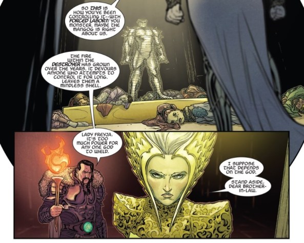 Cul has essentially been feeding the Destroyer the souls of unfortunate Asgardians which leads Freyja to admit that the Mangog is right – the gods are cruel and arrogant. What is learned here is that Cul, and by extension Odin, have been keeping the power of the Destroyer in their control at the cost of innocent people dying. It’s a stark reminder that not only is the Mangog correct in his assessment of the gods, but a reminder that even the gods remain at the top of the proverbial food chain at a cost. In this case, they stay in power at the cost of the very people whom worship them and they have sworn to protect.