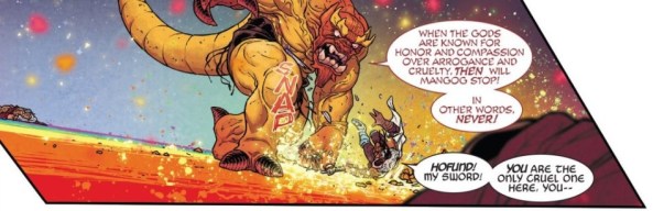 Yes, the Mangog is on a god-killing rampage, seemingly to atone for the sins committed by the gods. While it’s tempting to think that this statement is just a bunch of hot-air, one has only to look at Odin and the other gods not named Thor to realize that what the Mangog says is true. The gods have been cruel and they have been arrogant for ages upon ages. Now the Mangog has returned and the gods must pay the cost for the way they have acted. In this way the Mangog’s assault almost seems like a good thing – he is the cost that keeps the gods in check from being unspeakably cruel forever. While that’s a tempting way to view things, the Mangog seems so full of rage that it seems unlikely he will stop at the gods. Essentially the question now is, what will the cost be to get the Mangog in check? We can hope it’s the gods lives, but that seems unlikely.