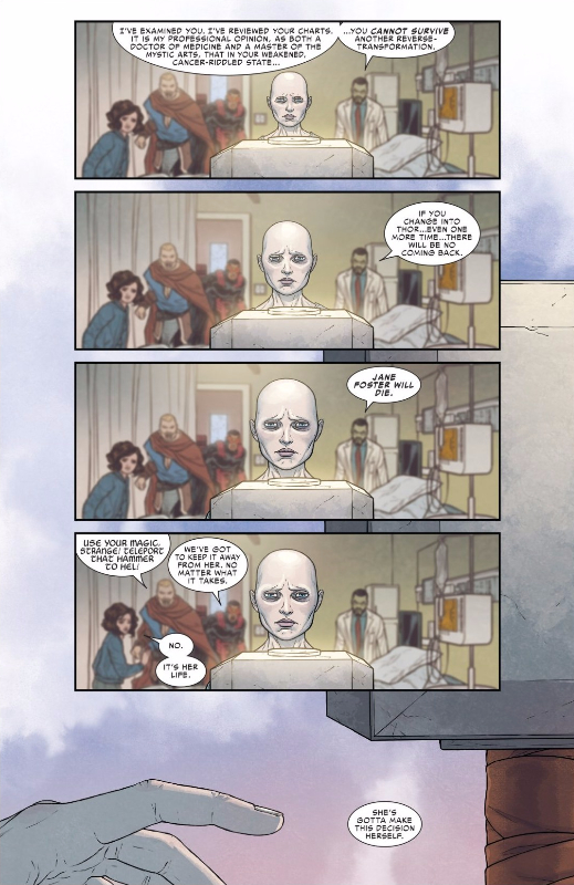 All this talk of cost brings the story back to Jane Foster, who more than any character in this series understands just how much power can cost. She is unable to confront the Mangog because her superhero friends – Doctor Strange, the Falcon, the Odinson, and Roz Solomon- have instigated an intervention to try and convince her to put Thor on hold for awhile so her cancer can be healed. As Stephen details to Jane after examining her with magic, turning into Thor is literally costing her her life.