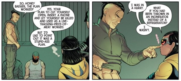 Tom Taylor is excellent at fleshing our supporting characters, I’d love to see him on a team book — Injustice notwithstanding. Apart from their pre-established best friendship, this issue makes it clear that Gabby is the perfect Deadpool analogue. Gabby — or Honey Badger — calls attention to the more absurd elements of her family’s adventures without overdoing it. In case we missed Daken’s plan from last issue catches us up to speed while calling it out for being ridiculous and gross.