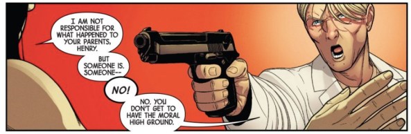 Taylor’s approach to Wolverine’s son Daken is very interesting to me. From what I’ve read of Daken, he’s been this father-hating antihero who will kill or fuck anything that’s in his way. In the “Orphans of X” arc, however, Daken has been a more likeable character in the company of his sisters. Though technically since Laura is Logan’s female clone, wouldn’t she be Daken’s…mom-dad? Nevertheless I like that having family warms Daken up a bit. Daken plays big brother to Gabby and Laura in different ways. Gabby is the little sister that admires Daken because he’s a rebel without a cause who tries to keep her at arm’s length. However, Laura is the selfless sister who gives everything for her siblings and asks for nothing in return. Which is why it’s a lot more touching that Daken goes out of his way to ensure that Laura gets to bury her mother — or at least a clone of her mother. I eagerly await what Daken’s future holds in particular, and hope that he makes more appearances in All-New Wolverine.