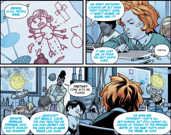 Because despite the science fiction trappings, Motherlands’ world is only a slight exaggeration on our own, and the most dystopian elements are really a natural progression of the culture. On the first page, we’re shown a school where smiley faced emoji holograms drone on to bored, disengaged children. It’s not a criticism of teachers, note that the school administrators that we see are portrayed sympathetically, but it is the logical end result of our current obsession with privatization of government functions and the mercenary stripping of public education for parts.