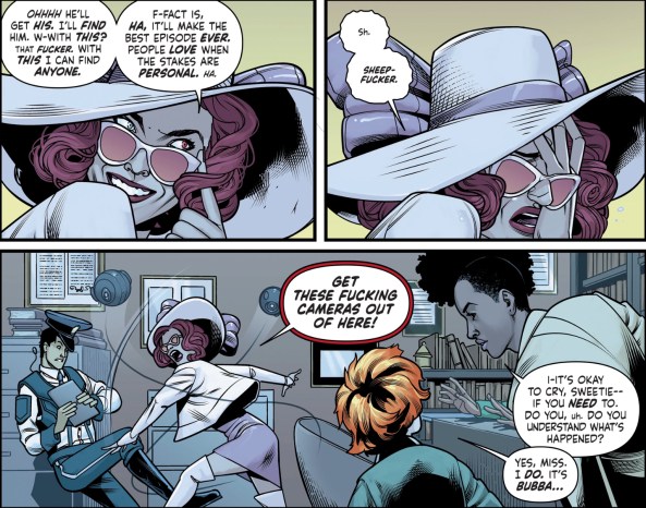 Given this title’s focus on the more toxic side of entertainment and technology, I’m interested to see this dynamic unfold. Tabitha took up the same career as her mother despite hating everything she’s ever stood for — why? Growing up in the entertainment industry, did she just feel like she never had a choice? Her violent methods are clearly influenced by the media, even if it’s by trying not to be like what she grew up seeing on television. Spurrier and Stott are painting a complex picture here, a portrait influenced as much by social commentary as it is by the personalities of the family whose story they’re chronicling.