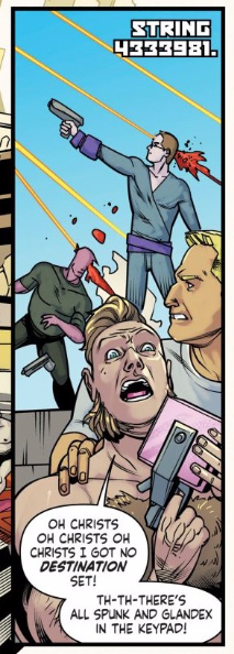 The slang is especially a Spurrier trademark, and though he doesn’t lean as hard on it in Motherlands as he does in, say, Angelic, it still plays an integral role in making this world feel unique. I’m especially fond of the subtle slang above, the use of the expression “Christs” instead of “Christ.” The world of Motherlands is one where the existence of alternate universes is common knowledge, and the multiverse pools their knowledge and technology. Of course common slang and expressions would evolve along too to eventually be inclusive of all universes (since there’s alternate universe, there’s alternate Jesus Christs, or so the reasoning would go). It’s such a subtle and simple idea to emphasize the ways this premise has changed the very nature of this world.