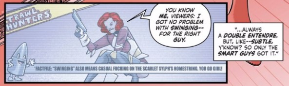 Mark already mentioned the similarities between Sylph and Youtubers, but this panel specifically reminded me of the more toxic and obnoxious corners of many fandoms. Yeah, sure, it’s tv stations and websites pandering to the lowest common denominator, but it’s also the viewers who think that watching a certain show or getting a certain joke makes them a genius even as the actual point flies right over their head. I can’t help but think about the unfortunately vocal segment of the Rick and Morty fanbase who think that liking the show literally means that they have higher IQs than other people. At first they just seem like a minor annoyance, until all of a sudden they’re standing on a McDonalds counter causing riots over Szechuan sauce. That the character saying all this is also a criminal spouting misogynistic, anti-SJW right-wing rhetoric isn’t too far a cry from where some of these guys end up, or at least from the kind of harm they end up causing.